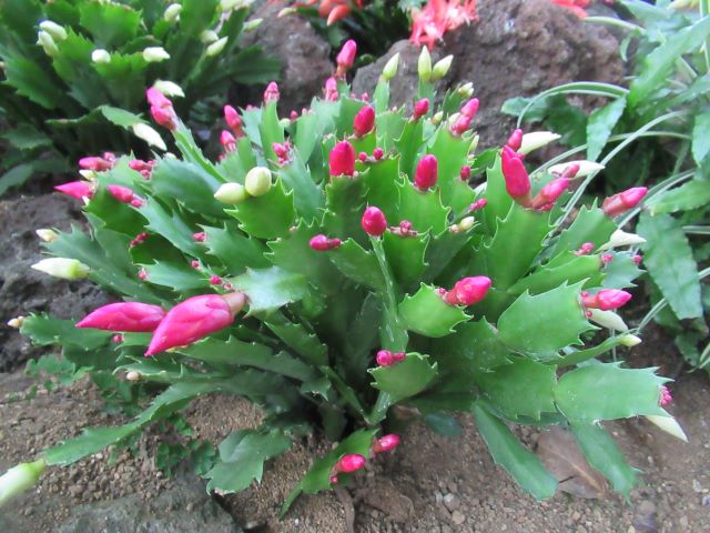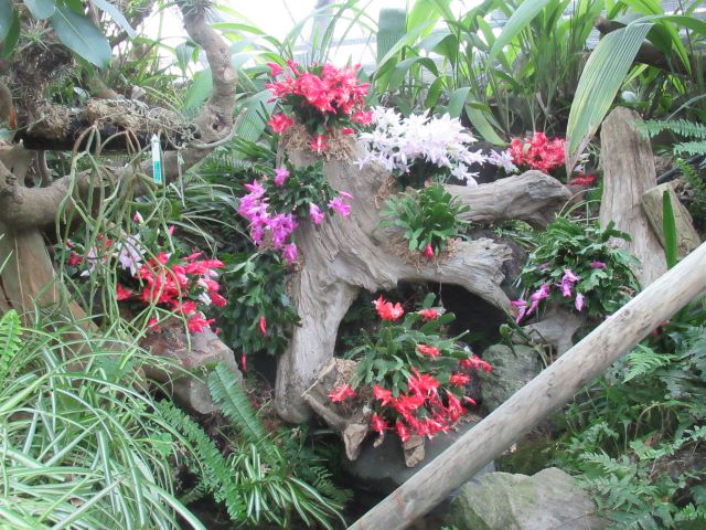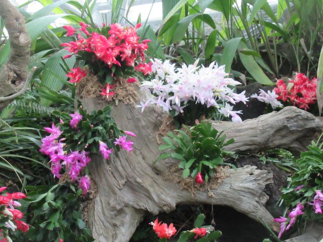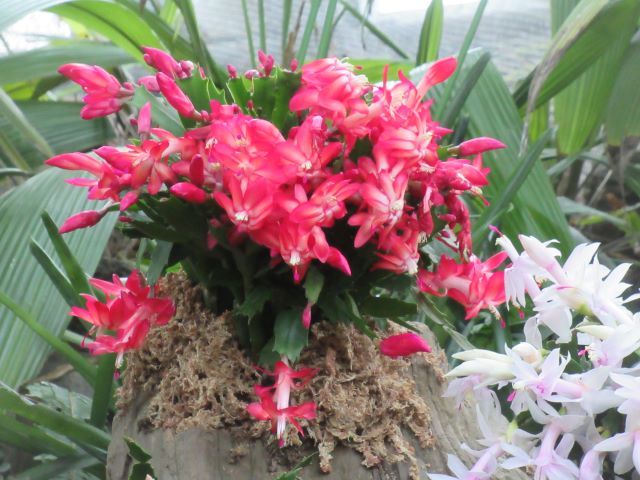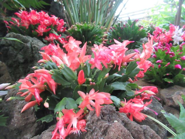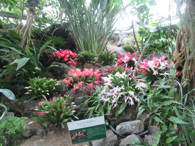 サボテンを愛する皆さん!  新年あけましておめでとうございます。 今年も伊豆シャボテン動物公園と共に素敵なサボテンの世界を楽しんでいただけるようスタッフ一同、はりきって参りたいと思います。   冬の時期ではありますが、本公園ではこんな時期こそ美しい花を咲かせる「シャコバサボテン(Schlumbergera  hybrid)」が、ただいま第3温室(森林性サボテン館)で見ごろを迎えています。(フクロウもいますが) このシャコバサボテンは、「クリスマスカクタス」とも呼ばれ、クリスマスの頃(正確には11月頃位からですが)に花屋さんに並び、花の少ない冬の風景を美しく彩ってくれる赤、ピンク、オレンジ、白などの美しい花を咲かせます。 じつは環境さえよければ、一月を過ぎても咲き続け、本公園でも一月半ばくらいまでは花が楽しめるものと思われます。         ほら♪ 下の写真のようにこれからつぼみが開いていこうとする株もあります。         シャコバサボテンは花屋さんで鉢植えにされている姿でおなじみのサボテンですが、本来の故郷はブラジル、リオデジャネイロ州のオルガン山脈という所! 標高800~1,800m前後の霧が多く湿度の高い雲霧林(うんむりん)という森の中にひっそりと生えているじつはとても見つかりにくい希少なサボテンです。   シャコバサボテンはこのような場所で、じつはランやシダ類と同じように大きな木や岩に張り付くようにして暮らしています。(これを着生(ちゃくせい)といいます) したがって、この公園でも自生地のイメージに合わせて大きな枯れ木に植え付けて展示してみました♪ 枯れた大きな木の根元の部分に、穴を開け、シャコバサボテンを水苔と供に植え込んでみました(苦労しました・・・) この花で満ちた枯れ木を勝手に「腐れ根の王」と呼んで愛でています。   少しでも、シャコバサボテンの生える自生地のイメージを感じてもらえたら、と思っています。       じつは木の上にもいたずら心でシャコバサボテンを水苔で張り付けて植栽しています(ちょっと見つけにくいですよ。 わかるかな?)   今年も素敵なサボテンや、多肉植物たちをどんどん育て、皆様にその面白さをお伝えできれば、と思っています。     植物エンターテイメント課 一同 記録:真鍋