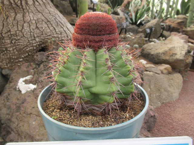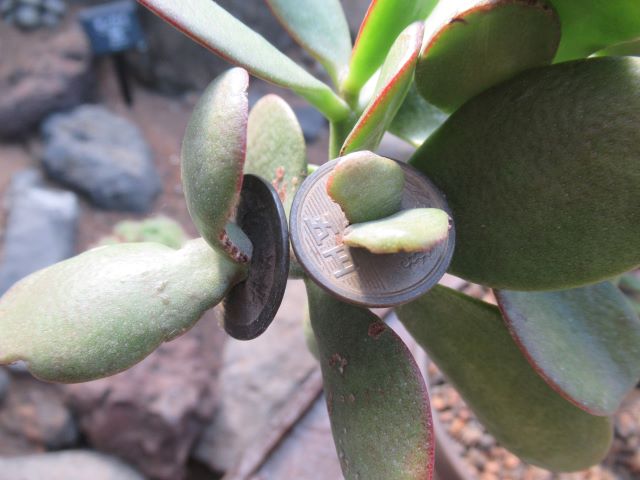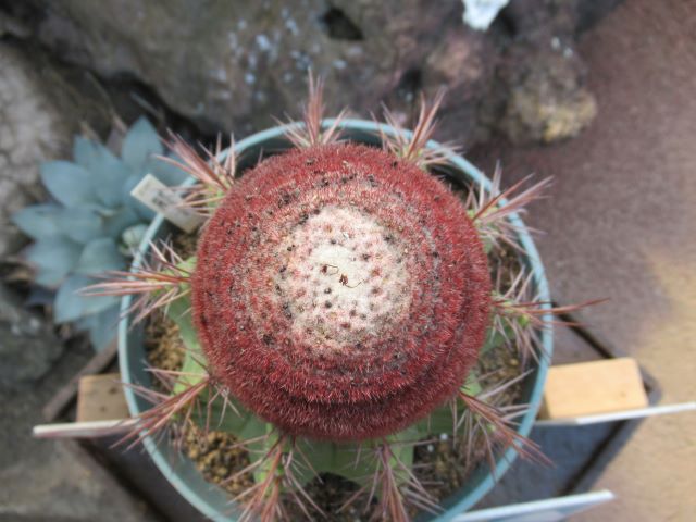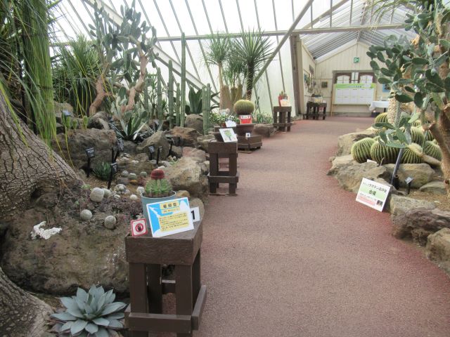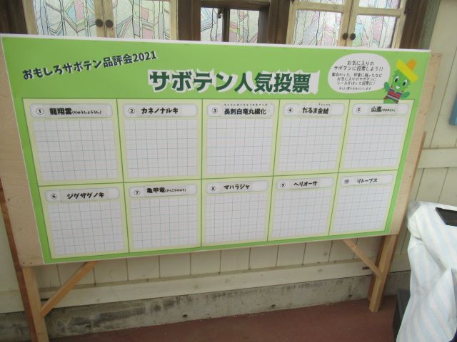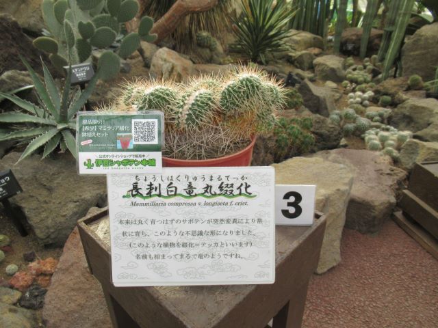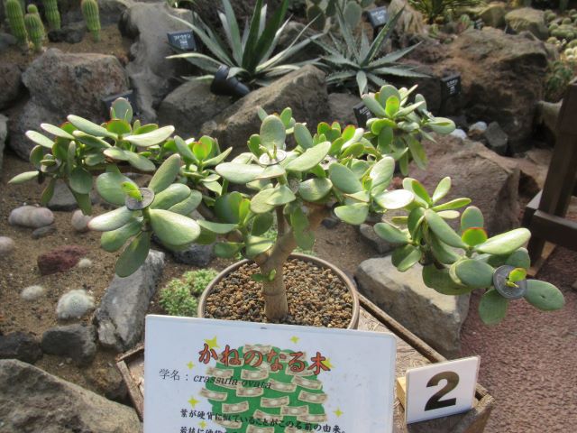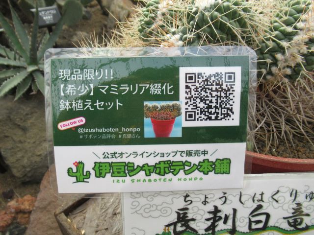 サボテンと多肉植物を愛する皆さん ! 今年も伊豆シャボテン動物公園、秋の名物(かな?)  「おもしろサボテン品評会」を第5温室(メキシコ館)出口付近にて開催しておりますよ~~~♪ 普段、小さすぎたり、寒さに弱くて常設できなかったり、形が個性的過ぎて一般の展示になかなか出すことの出来ない本公園のいわゆる秘蔵のサボテン・多肉植物を一斉に展示し、その中で、お客様の心を最もとらえることの出来た一番人気の「栄えあるサボテン」をお客様のご投票で決めよう!というこの企画、早いもので今年で8回目を迎えることとなりました♪(あと2回で10周年♡)   今年も、コロナ過のご時世を踏まえ、赤いシールの貼り付けによる投票で順位を競っております。   という訳で、今年も皆様にも、出展植物の魅力などささやかながらご紹介したいと思います♪   先ずはエントリーナンバー①番 「竜翔雲(リュウショウウン Melocactus  sp)」 赤いトルコ帽子のようなものをかぶった、何とも個性的な一度見たら忘れられない南米のサボテン! この赤い帽子の正体は「花座(ハナザ)」別名「セファリウム」と呼ばれる器官。このサボテンの仲間「メロカクタス属」のサボテンは小さいうちはただの丸いサボテンですが、大人になるとこの花座が発達して頭の上にのるようになり、ここから花が咲きます。       この竜翔雲の場合もやはり、春になるとこの帽子のような花座の部分から小さな星のような鮮やかな赤い花が咲きます。 花が咲き終わると、しばらくたって赤いこれまた鮮やかルビーのような小さな実が出来ましてその中に種が入っています。 上の写真をよく見てください!赤い帽子の中に小さなゴマのような黒い種があるのがわかりますでしょうか?(わかりにくいかな~)これは実がはじけて種だけが花座に残ったものです。             このメロカクタス属のサボテンは、このような帽子のような花座を頭の上に発達させるため、それを天空に君臨する雲に例えて大抵「~雲」と雲の名前が下に付くようになっています。この竜翔雲も天に飛翔する竜の形をした雲になぞらえて説明のプレートを作ってみました! (えっ!雲に見えない・・・・・・)             この竜翔雲、ふがいない話ですが今だにはっきりとした学名がわからず現在調査中! どうも「華雲(カウン Melocactus  peruvianus)」というメロカクタスによく似ているようなのですが・・・ もし華雲であればこのサボテンの故郷はペルーということになります。       故郷が南米のしかも暖かいところに生える(波のかぶるような海岸近くに生えるそうです)というだけあって、このサボテンは寒さが苦手!昔は日本にもたくさん入ってきたのですが、冬の寒さに耐えきれず、今ではこれほど立派な花座を持ったメロカクタスはなかなか手に入りません。 寒さに弱いのが玉にきずですが、サボテン好きなら一つは保有しておきたい愛すべきサボテンです。               さて次は、エントリーナンバー②番「金の生る木(カネノナルキ=花月〈カゲツ〉 Crassula  ovata  、ベンケイソウ科) う~ん! 日の光を受けてまさに名前の通り、植物が金キラ金!に輝いております。 んっ!この金の生る木、何かくっついているような・・・?   そ~です!この金の生る木には、本当にお金(古銭)がくっついているのです!  この金の生る木、別名花月(カゲツ)という植物は、丸い膨らんだ葉っぱをコインに見立てて、英語でも「マネーツリー(money  tree)」と呼ばれている幸運を呼びそうな植物です。 日本に渡来したのは昭和初期、といわれていますがこの時、日本の栽培業者がこの植物を縁起物として売り出すために5円玉の穴をこの植物の頂芽に通して固定し、若枝が5円玉の穴を通ったまま成長するようにして、あたかもお金が実っているように育て上げ、縁起の良い植物として仕立てたといわれています。       硬貨の穴に植物を通した後、お金が落ちないようにするには、長い目でゆっくり育ててあげなければならず、制作者の苦労がしのばれます。ちなみにお金を植物にくっつけてもその後の植物の生長には全く問題はありません。           この金の生る木こと花月は、育てやすい頑丈な植物で、昔はどこの家庭でも、盆栽として一鉢はこの植物が置いてあったものです(今でもご家庭で育てている所があると思います。) ちなみに無霜地帯の露地で栽培すると、3メートル以上の大きさになります。 伊豆シャボテン動物公園でも、第2温室(アフリカ館)にとても大きな株がありますよ♪ 大きく成長した金の生る木は、冬頃白色から淡桃色の小さいきれいな花をたくさん咲かせます。(お金はくっついていませんが・・・)           縁起のよさが幸いしてか、現在この金の生る木、なかなかの投票数となっております♡               さて、続きましてはエントリーナンバー③番「長刺白竜丸 綴化(チョウシハクリュウマル テッカ  Mammillaria  compressa  v. longiseta  f. crist) 本公園、初公開!どうよ!このクネクネのくね
