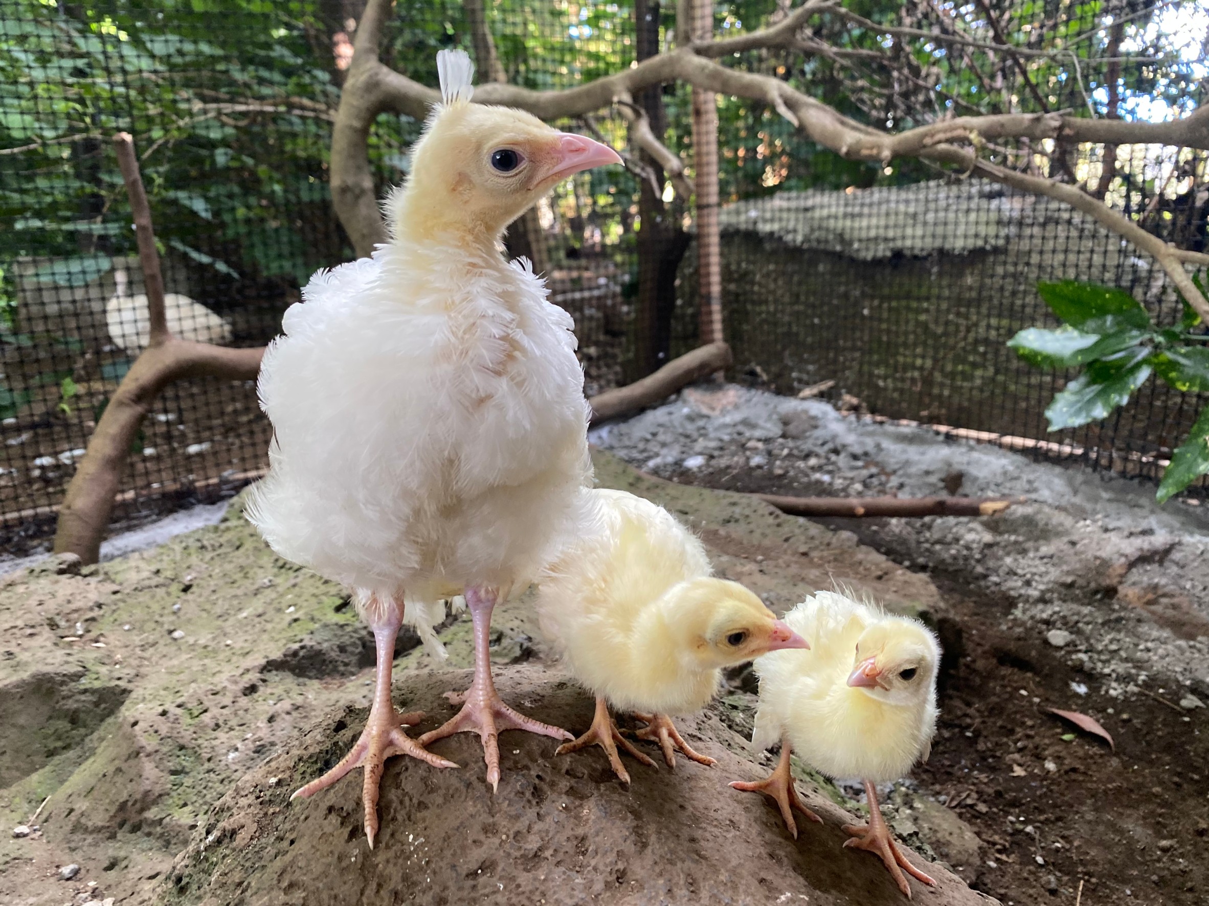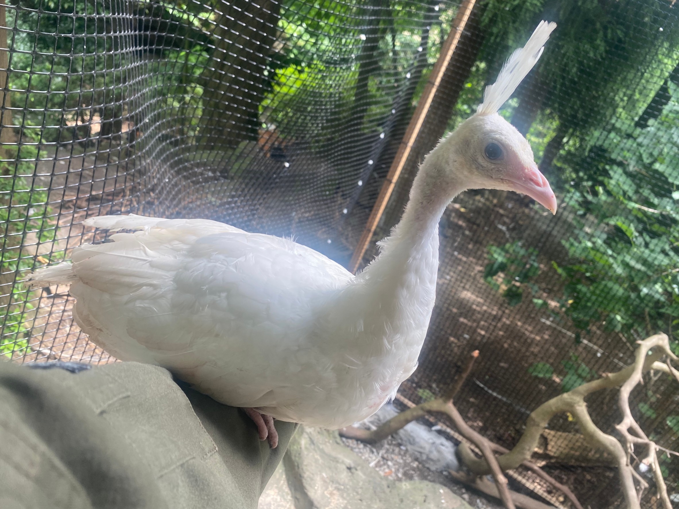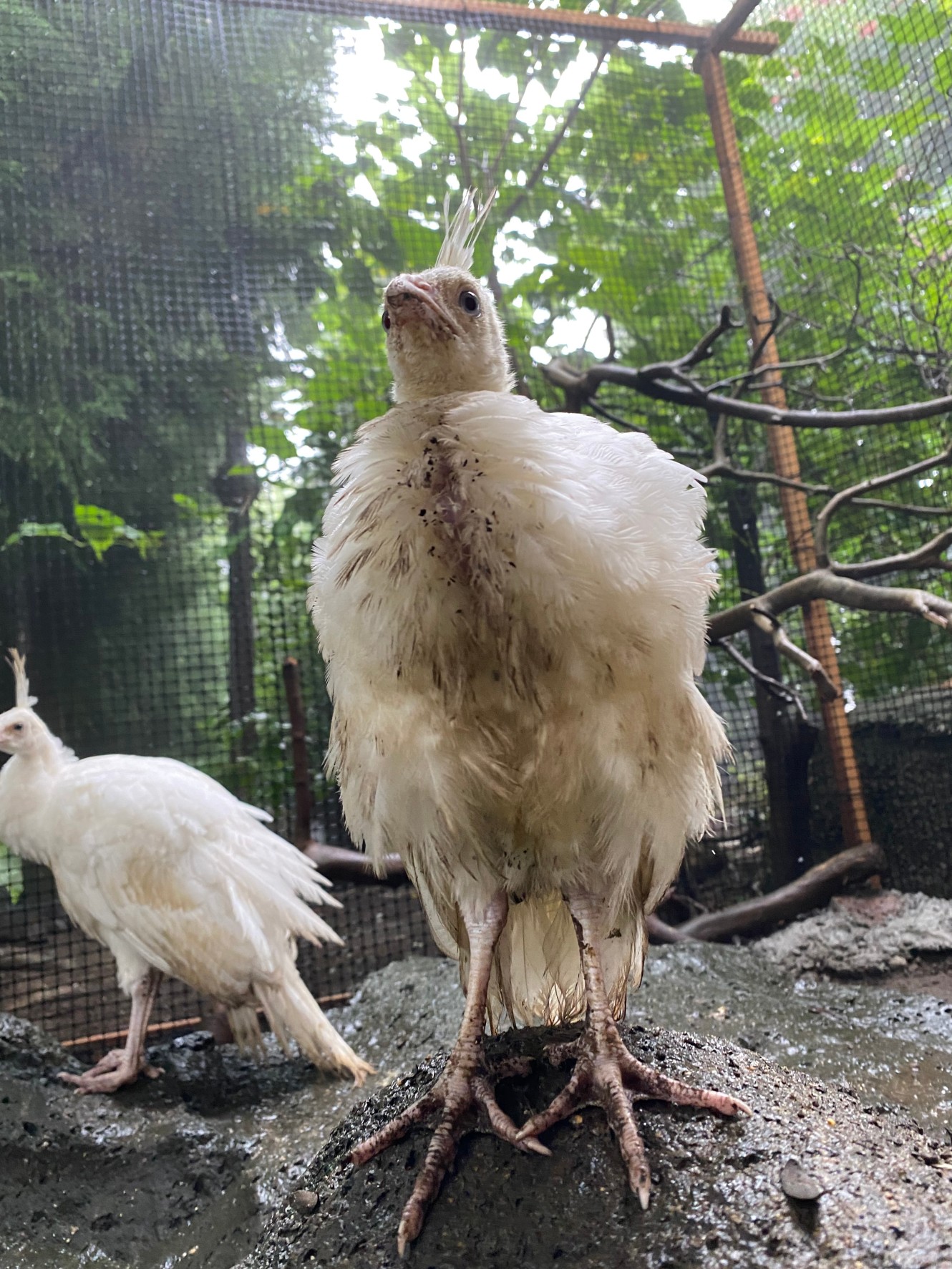 シロクジャクの雛が今年たくさん孵化しました! 孵化した時は黄色いひよこみたいな感じですが、だんだんと白くなってきて 今一番大きい雛はこんなに白くなってます!!(光ですごい神々しい…✨) この間雨上がりに外に出すとドロクジャクになって帰ってきました(笑) 皆さんにお披露目するのはまだ先になりますが、SNSで成長記録を発信していきたいと思います🍂