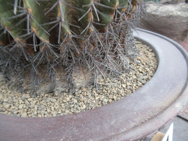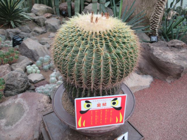 なんてことのないただの金鯱なんです(年齢は60年以上経っていますが)。この金鯱は以前一度成長が止まり、死にかけたことがあります。ところがその後見事に持ち前の生命力を発揮して再生し、再び丸く成長を始めた為、真ん中がくびれたこのようなダルマのような姿へと成長したのです。(まさに、「七転び八起きの達磨!」) サボテンの生命力の強さを示すと共に植物を育てることの難しさ、大切さを教えてくれるサボテンでもあります。
