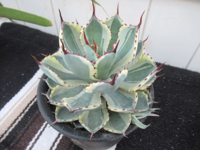 こっちは「ポタトラム錦(Agave potatorum variegated)」青緑色の陶器のような肌と黄味がかった白い模様と赤い作り物のような美しいトゲが特徴です(ずいぶん綺麗なものもあるでしょう!) アガベという植物はただ美しいだけではなく私たちの生活にもいろいろ身近な形で利用されています。 有名なお酒のテキーラもこのアガベの一種「アガベ・テキラーナ」から作られます。他にもはちみつのようなシロップの原材料になるものやロープや袋の材料としてじつは世界で広く利用されています。 ちなみにアガベの仲間はメキシコの先住民には「マゲイ」と呼ばれ、プルケというお酒の材料になり、神聖な植物として尊ばれていたといわれています。(どぶろくのようなお酒だそうですよ)