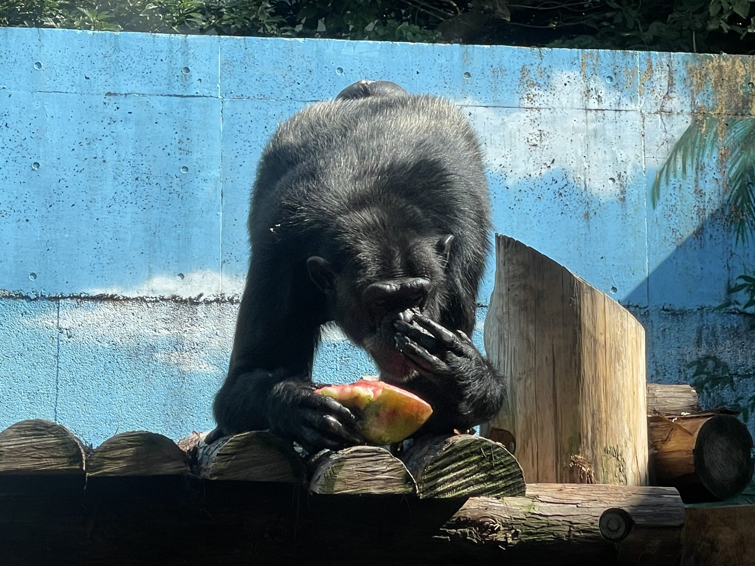 何層にも重ねて作りました! リンゴにブドウ、オレンジ、キウイなどフルーツ盛沢山🍎🍇🍊🥝 おいしそうですよね~? 誰が一番に食べるのか楽しみです! チンパンジーには先取権というものがあり手に取ってしまえばそれはその子のもの! また、動物にも私たち人と同じように感情や性格がある! 今回はそんな性格、個性が見えた氷フェスティバルになりました! 氷にキスする子もいれば独り占めする子もいる。あきらめる子もいたりして・・・