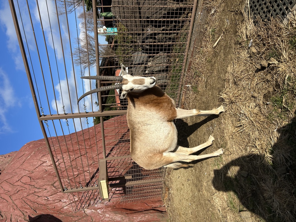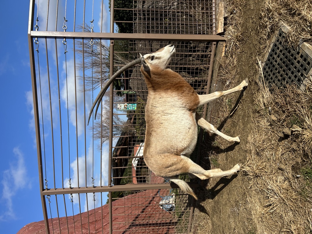 体が白くて、後ろに反った長い角が特徴です。暑い砂漠で熱を反射するために体が白くなったといわれているんですよー!